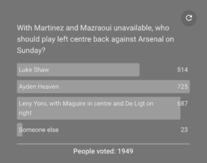 Regardless of Yoro often beginning on the precise of the defence, 35% of followers felt that it could be higher to shift the younger Frenchman to the left and put Harry Maguire within the centre with Matthijs de Ligt on the precise.